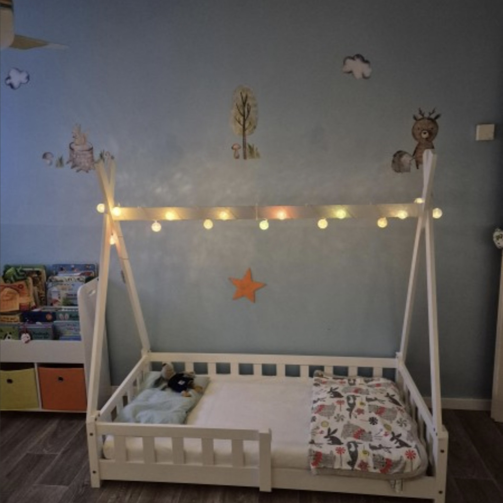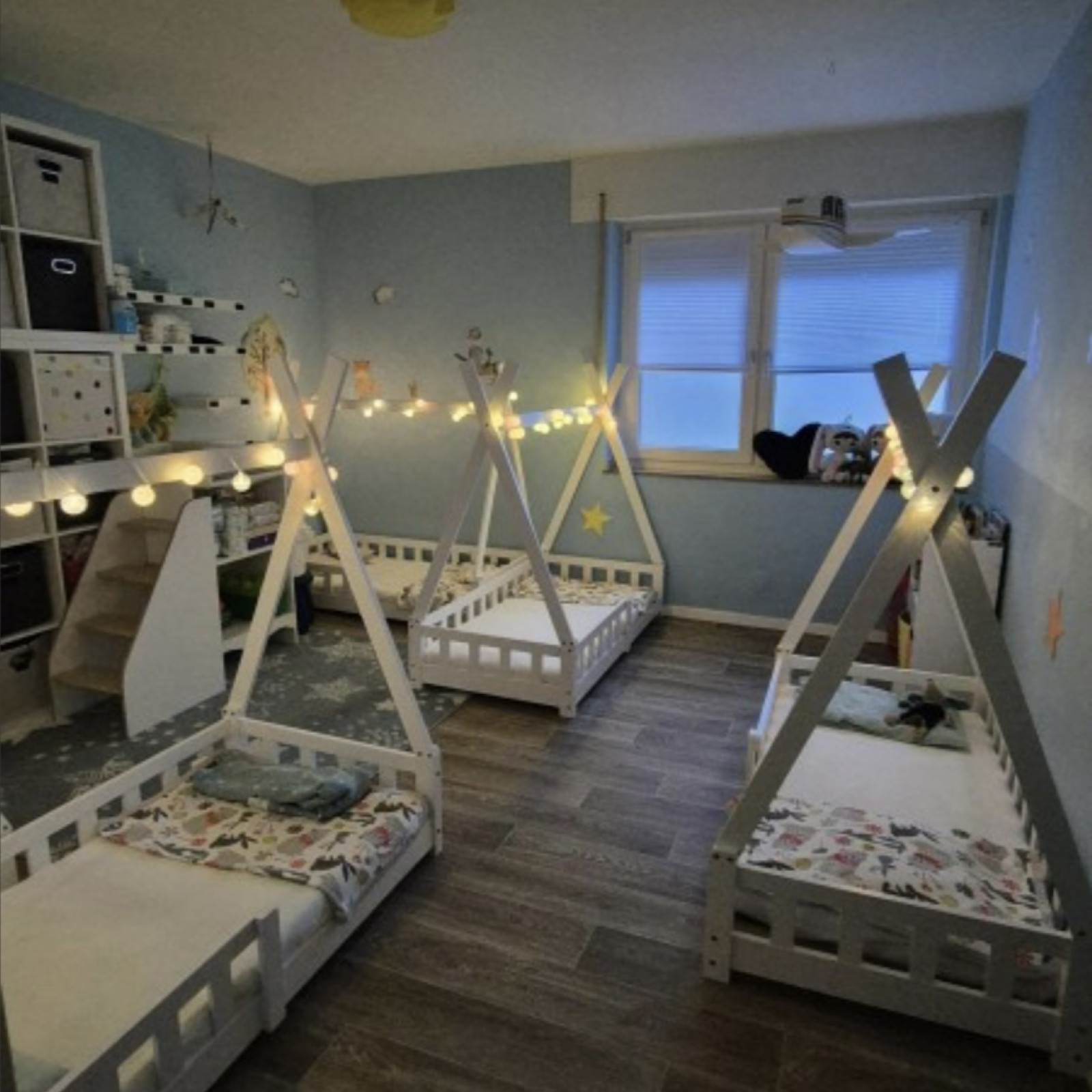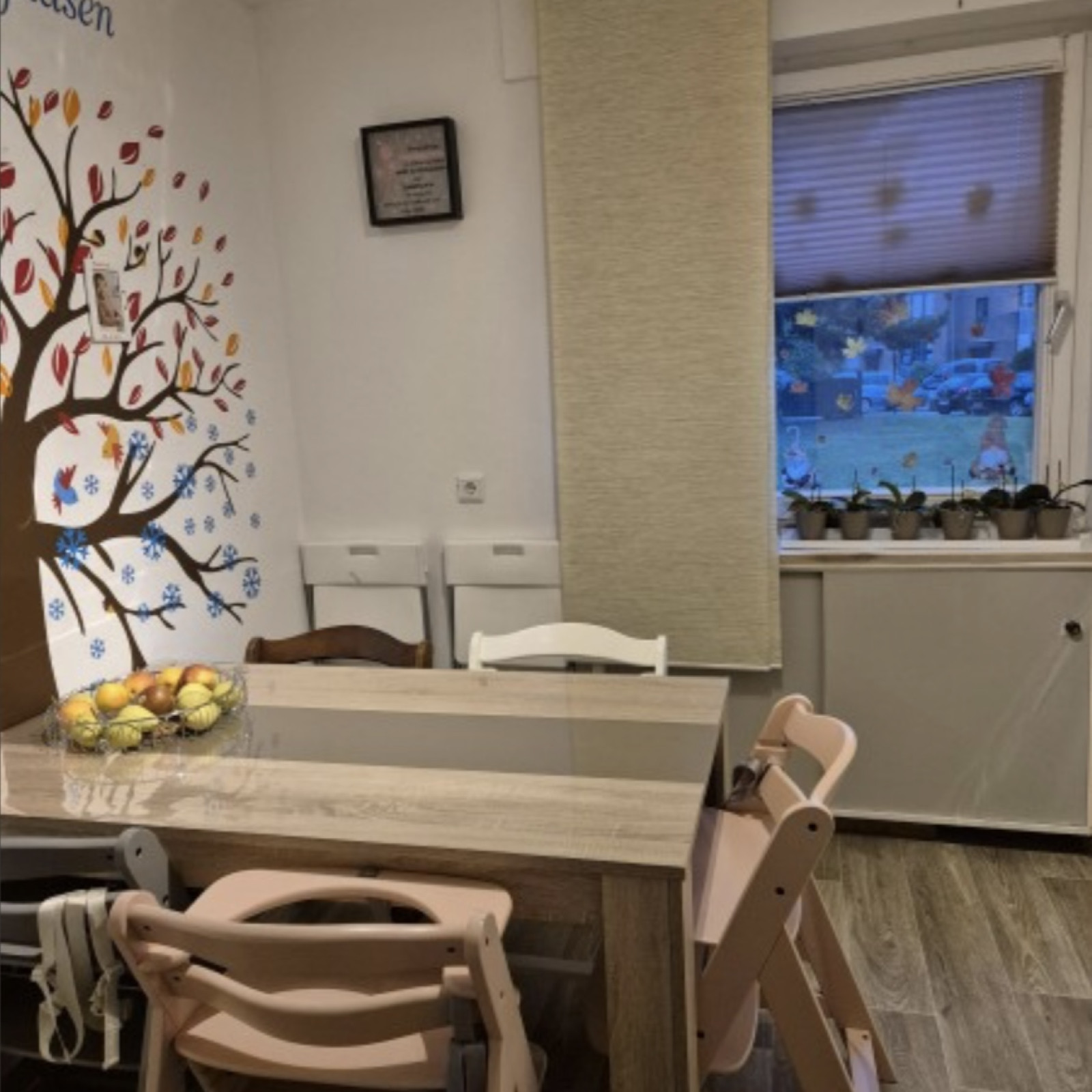Kinder haben besondere Bedürfnisse an die Einrichtung: Für den Mittagsschlaf gibt es den Schlafbereich mit einem eigenen Bett für jedes Kind. Die Küche ist besonders wichtig: hier bereiten wir – auch oft gemeinsam mit den Kindern – die Mahlzeiten zu und lassen es uns zusammen am großen Tisch schmecken. In den Räumen gibt es verschiedene Bereiche zum Basteln oder Spielen – manche Bereiche werden auch für verschiedene Anlässe umgeräumt.